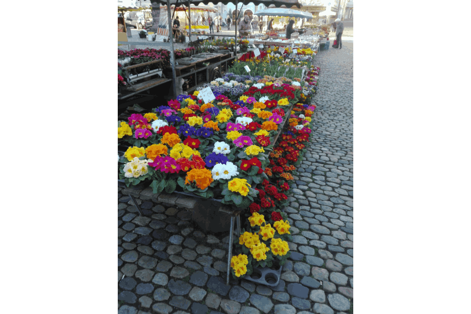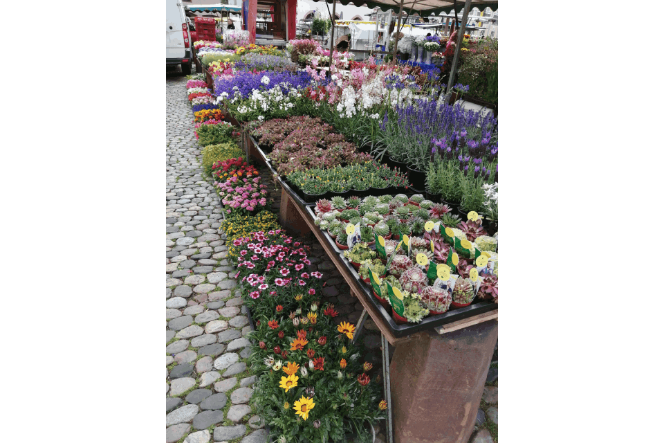 Sie finden uns von dienstags bis samstags auch auf dem Wochenmarkt Münstermarkt in Freiburg, wo wir Ihnen ein stets wechselndes Sortiment an besonderen Blumen und Bepflanzungen anbieten.